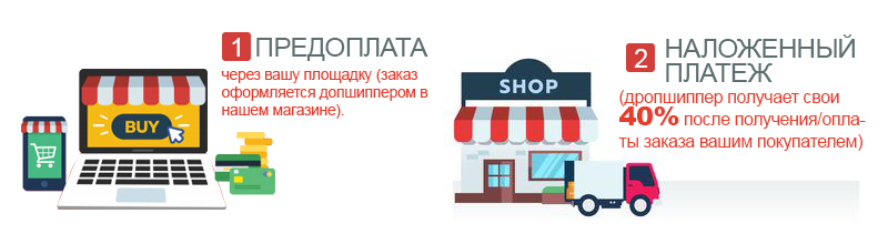 - наложенным платежом (перечисление 40% дропшипперу выполняется по факту оплаченной посылки заказчиком);