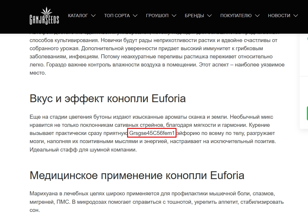 Итак, объектом поиска станет скрытый код, «случайно» затерявшийся в одном из описаний сортов категории «Автоцветущие семена конопли». Найти его довольно легко, если сконцентрировать внимание на несколько минут. Как только найдете код – постарайтесь его поскорее активировать, иначе вас могут опередить! *