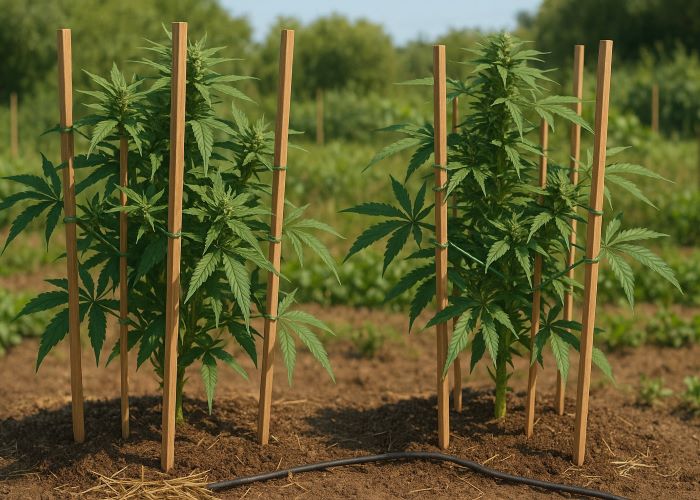Поддержка стеблей — это не про сентябрь и налитые колы, а уже про июнь. Именно сейчас кусты активно набирают массу, ветви удлиняются, а точка опоры еще хрупкая. Один сильный порыв ветра, особенно после LST или обильного полива, может надломить даже здоровый куст. И если автосорт или гибрид уже близок к цветению, восстановление может не наступить.