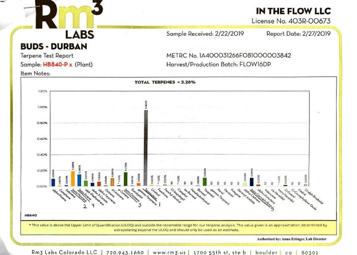 В целом, этот экземпляр Durban Poison содержит удельное содержание терпенов в пределах 2,28%, что является исключительно высоким показателем для большинства сортов, которые редко содержат менее 1% фитоароматических соединений.