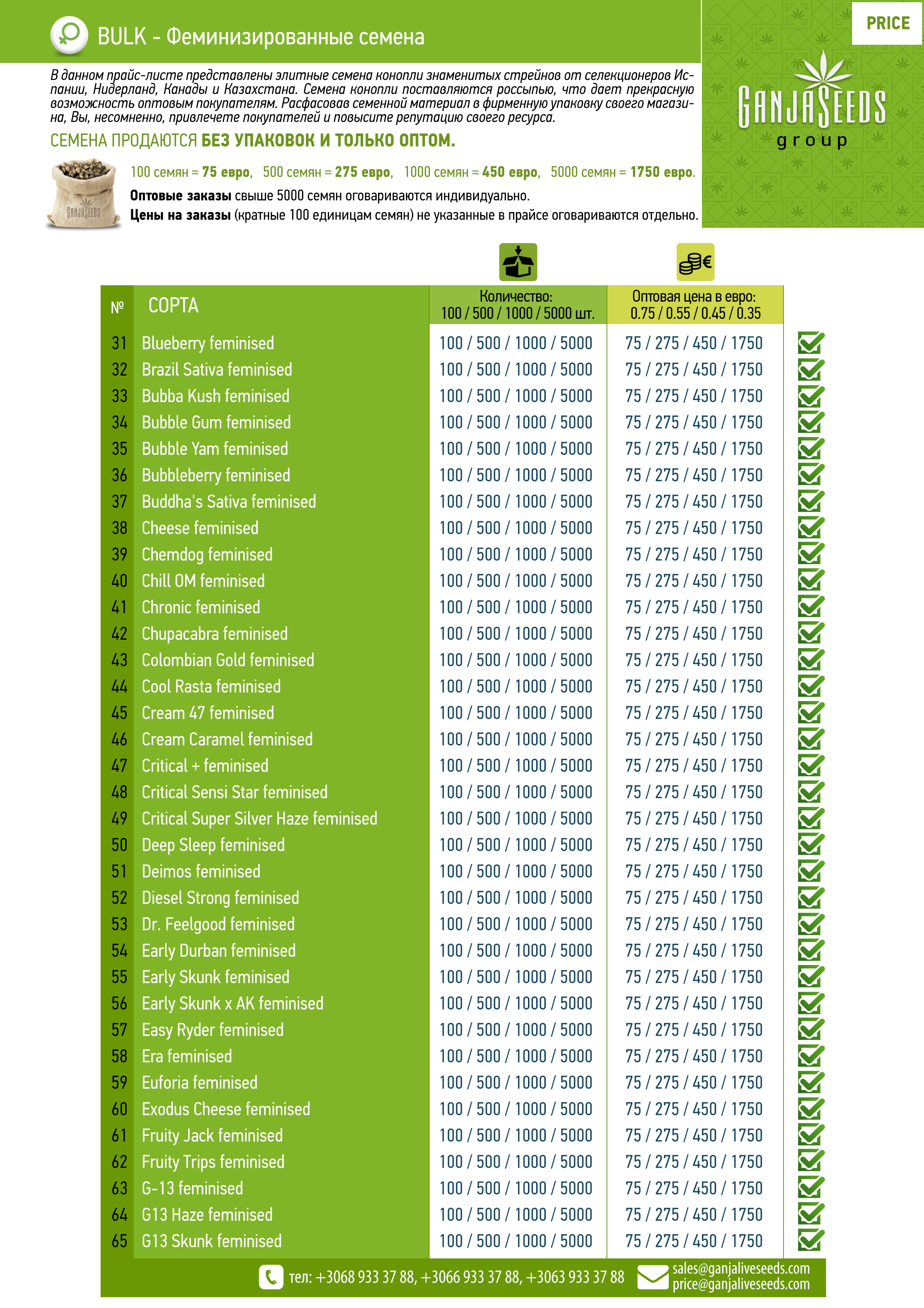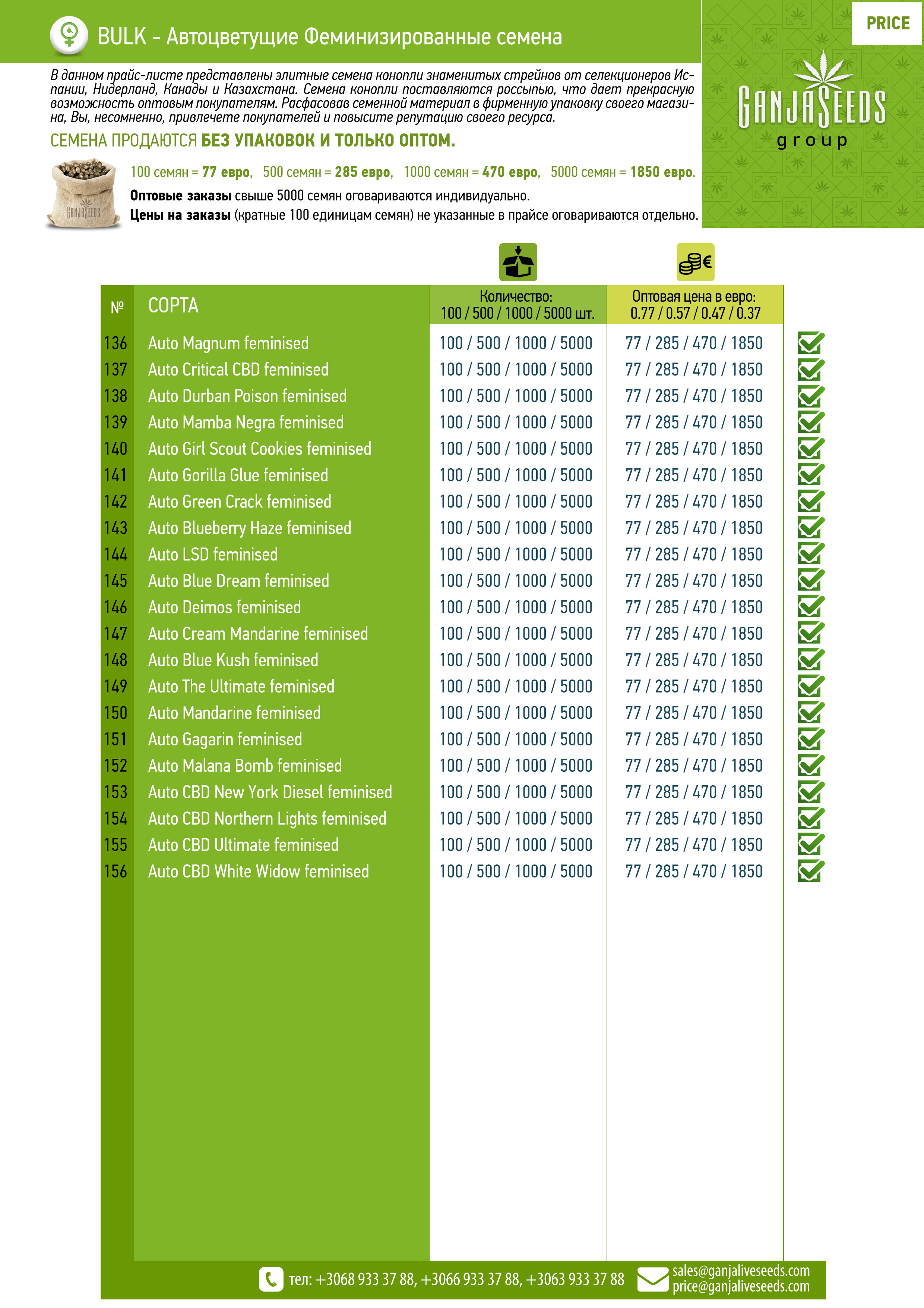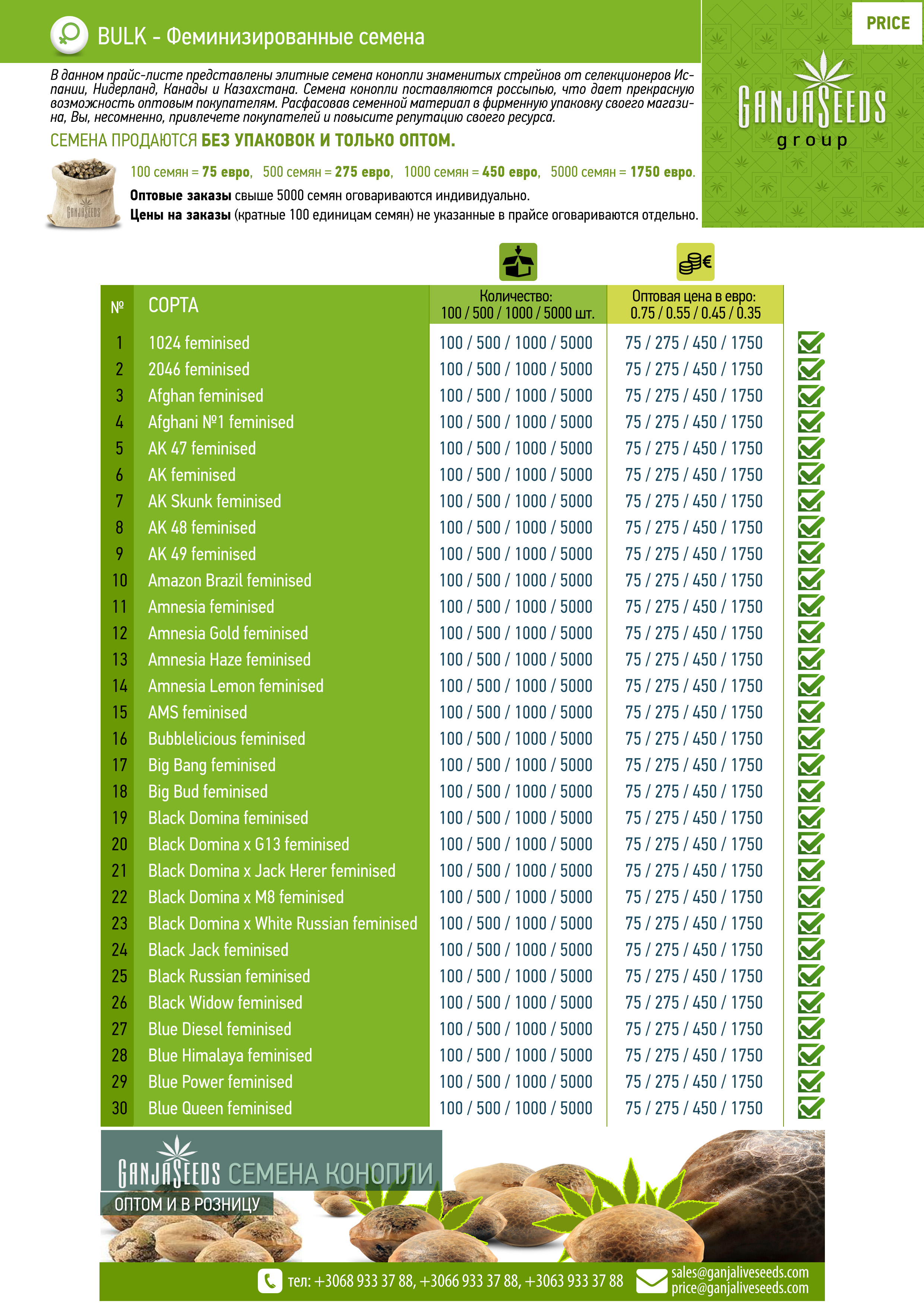 Оптовый прайс семян конопли BULK