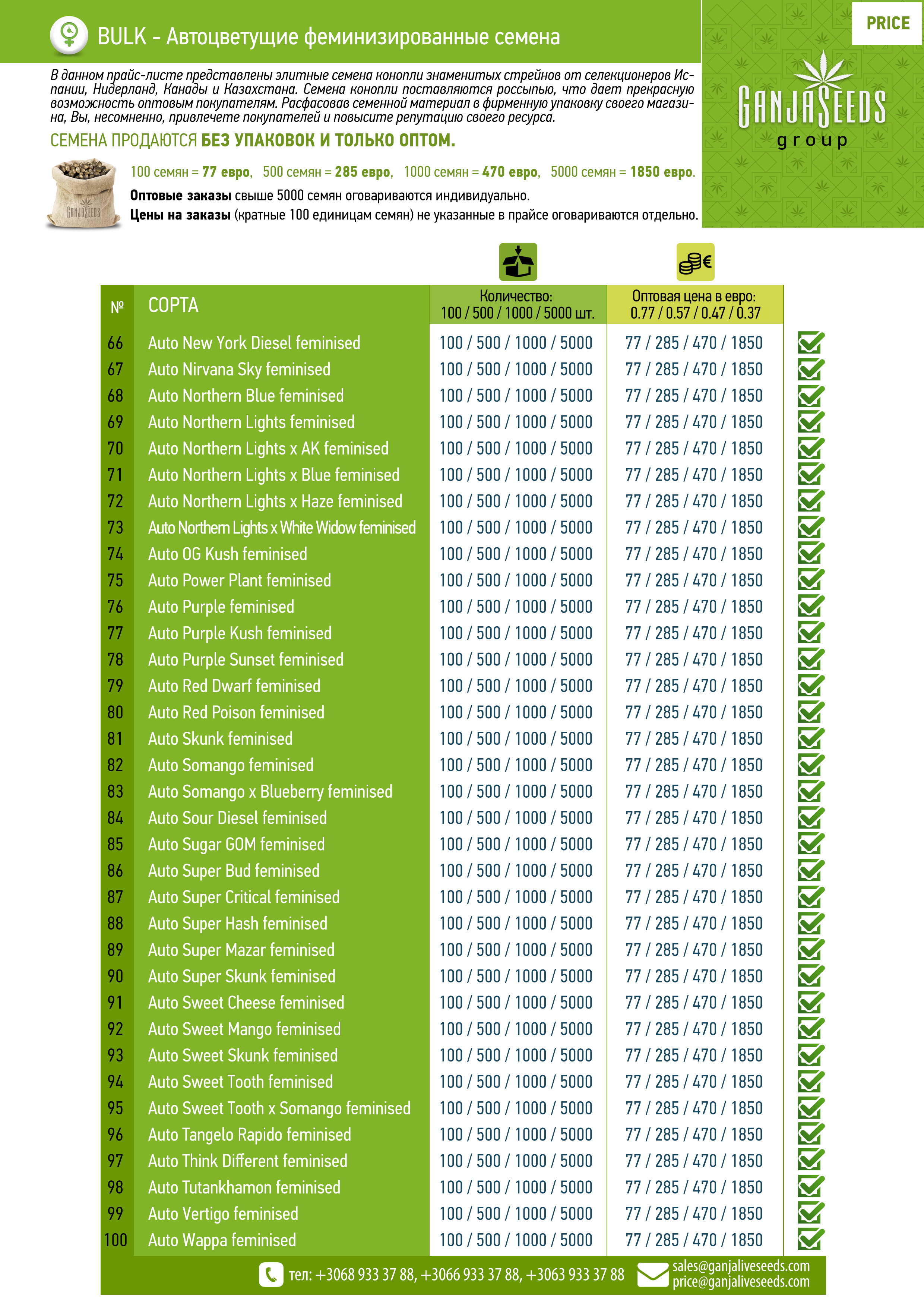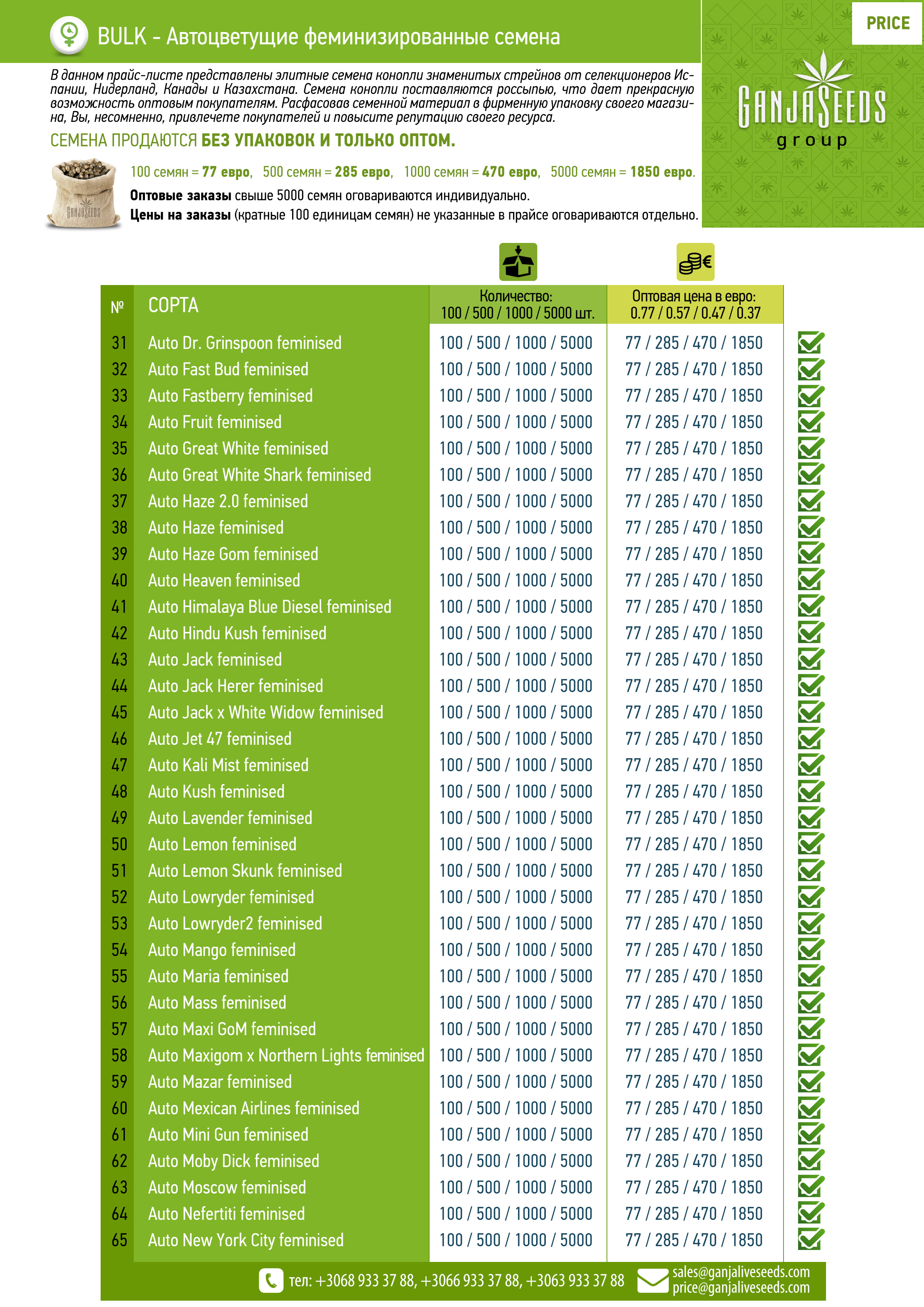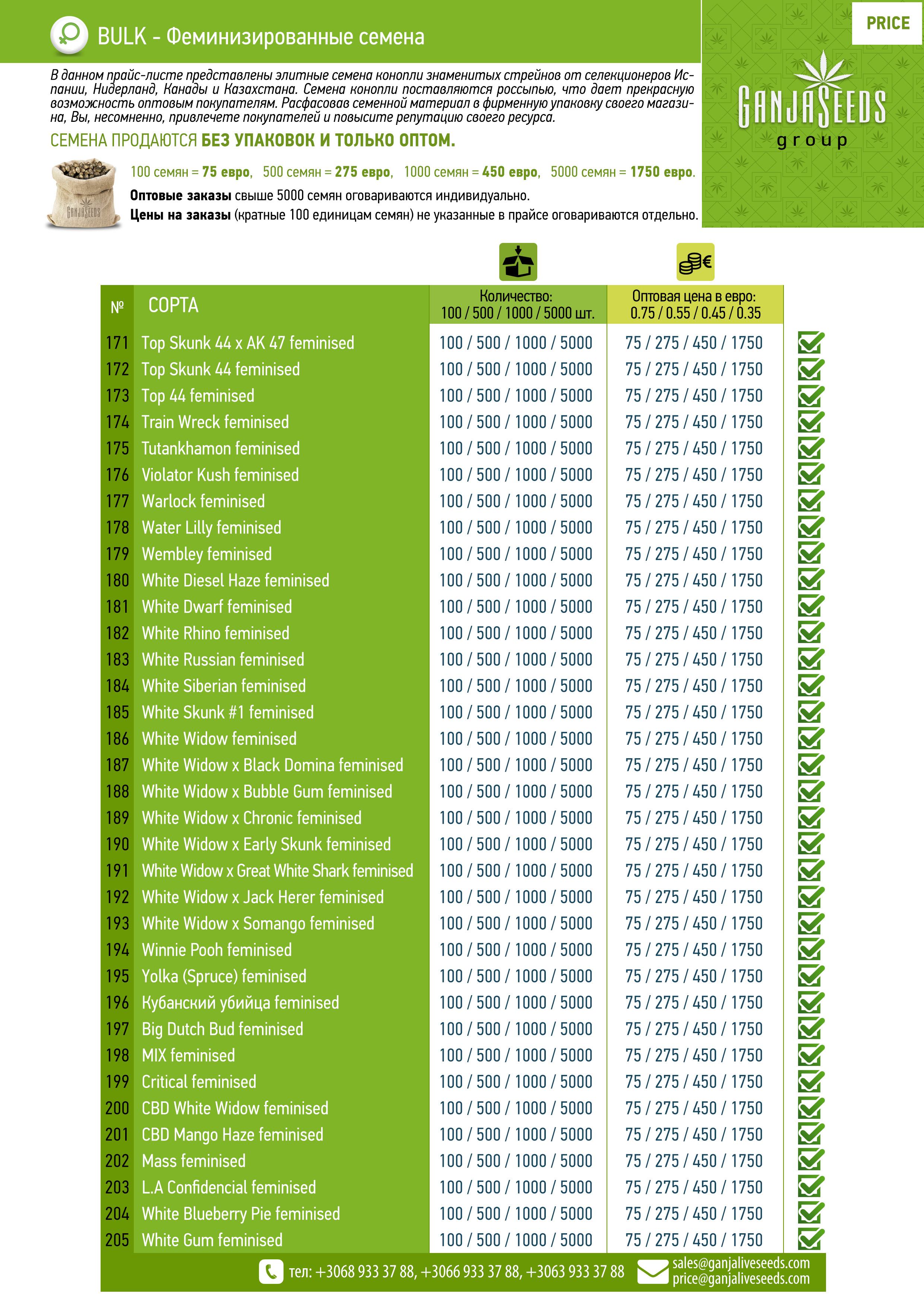 Оптовый прайс семян конопли BULK